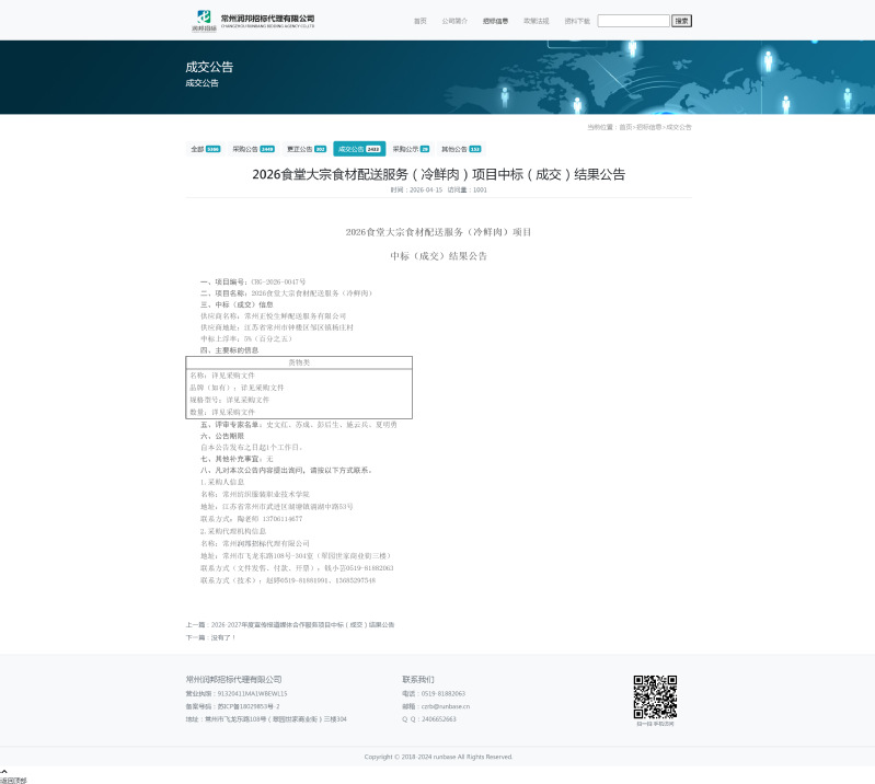 【中标公告】2026年食堂大宗食材配送服务(冷鲜肉)项目中标结果公告