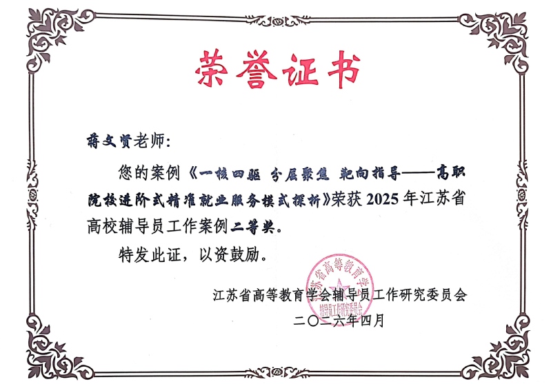 数字商贸学院辅导员蒋文贤老师撰写的案例《一核四驱 分层聚焦 靶向指导——高职院校进阶式精准就业服务模式探析》荣获江苏省高校辅导员工作案例二等奖。蒋文贤老师立足高职学生成长与就业指导一线,以高质量就业为核心,创新构建“一核四驱、分层聚焦、靶向指导”的进阶式精准就业服务模式,围绕学生职业规划、学风建设、心理帮扶、家校协同、社会实践等关键环节精准发力,形成可复制、可推广的高职就业指导与思政育人工作范式。