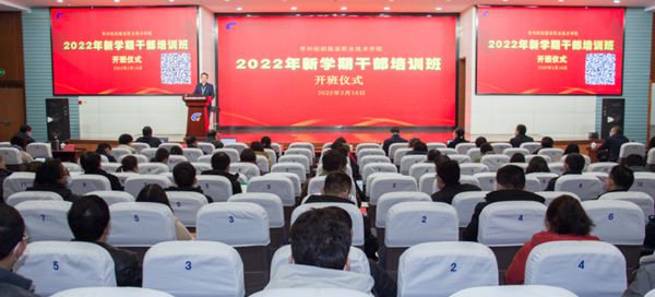 为提升学校各级干部队伍的思想政治水平、业务素质和综合能力,更好地开展新学期各项工作,推进学校“双高”建设,提高管理能力和育人质量,促进学校高质量发展,2022年2月16-17日,学校特邀中国职业技术教育学会现代农业职业教育专业委员会专家指导委员会委员、苏州农业职业技术学院原党委书记李振陆教授,常州市发改委党组书记、主任潘冬铃等专家为学校科级及以上干部、党总支委员、党支部委员、教研室主任、专业带头人、专业负责人等各级管理干部作了主题为《聚焦高质量发展,提高人才培养质量》、《实施‘“532 ”战略建设现代化 常州全力将宏伟蓝图变为美好现实》、高职教育发展的培训讲座。学校党委副书记、院长洪霄在开班典礼上作了动员讲话。他指出:本次干部教育培训,是深化学习型组织建设的需要,是加强管理队伍建设的需要,是提高管理队伍自身素质的客观要求,是学校抢抓战略机遇,实现高质量发展的现实需要,参会人员要正确认识开展培训的重要意义;他希望:通过本次培训,全体管理干部要提高学习能力、应变能力、执行能力和创新能力,要达到预期目的和效果;他强调:要端正态度、转变角色,勤于思考、活学活用,服从安排、严守纪律,珍惜机会、高