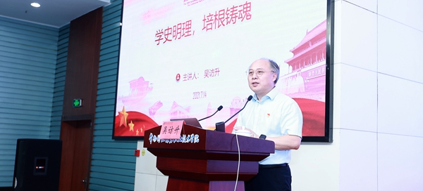 7月12日上午,我校召开党委理论学习中心组第8次学习会暨党史学习教育读书班第7次集中学习会,深入学习贯彻习近平总书记在庆祝中国共产党成立100周年大会上的重要讲话精神。校党委班子成员、全体中层正职干部参加学习,校党委书记吴访升主持会议。根据收看庆祝中国共产党成立100周年大会和习近平总书记重要讲话的感受,科技处处长李爱红、马克思主义学院院长陈利、机关党总支书记韩兰娟3位同志结合工作实际和学校发展做了精彩发言。党委副书记、院长洪霄以《中国共产党为民族复兴做出了伟大贡献》为题,从“中国共产党肩负着民族复兴之大任应运而生、百年奋斗历程中的丰功伟绩更加清晰、‘三个必须’既是历史经验又是工作要求”三个方面分享了学习体会。系统阐述了“党在新民主主义革命时期、社会主义革命和建设时期、改革开放和社会主义现代化建设新时期、中国特色社会主义新时代”四个时期的丰功伟绩。详细剖析了迈进新征程、奋进新时代的工作要求:必须始终坚持马克思主义指导地位不动摇、必须始终不断推进实践基础上的理论创新、必须始终坚持不懈推进理论武装。吴访升以《弘扬伟大建党精神 凝聚磅礴奋进力量》为题,分享了四点学习感悟:一是弘扬伟大建党精神