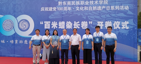 为发挥党建引领,深化中西部院校深度合作,6月17-18日学校党委书记吴访升、招生就业处处长董裕乾、服装学院院长袁红萍、创意学院徐英姿老师受邀参加黔东南民族职业技术学院“献礼百年华诞·培育非遗英才”主题系列活动。我校一行首先在铜鼓广场见证百米蜡染画作舒卷启动仪式,文创市集开市、匠人学子百件精品展示及招聘会等活动。来自省内外民族文化专家、兄弟院校领导、企事业单位嘉宾齐聚一堂,共话传统工艺发展,喜迎建党百年华诞。身着民族服饰的师生,伴随悠扬的芦笙乐曲,共同唱响《唱支山歌给党听》,一幅气势恢宏的百米蜡染画卷徐徐打开,一幅幅栩栩如生的民族蜡染图画展示了黔东南州丰富的少数民族风土人情。文创集市上,蜡染团扇、蜡染玩偶、手工银饰等一件件灵巧的工艺品纷纷亮相,让非遗与文创完美融合,匠心与匠艺魅力绽放。活动期间,我校一行在黔东南民族职业技术学院党委书记邱兴萍、副书记吴一生的带领下,参观了该校校史馆及民俗博物馆,详细了解学校的发展历程、专业特色,以及在非遗文化保护、传承及创新方面的有效举措。实地调研了该校护理系首批“全国党建工作样板支部”——护理系党总支第一支部,认真倾听支部书记冉丽老师介绍如何通过抓好党建