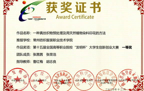 近日,第十五届全国高等职业院校“发明杯”大学生创新创业大赛在山东济宁举行。此次大赛由中国发明协会、山东省教育厅、山东省知识产权局、山东省科学技术协会主办,中国发明协会高职发明创新分会、山东理工职业学院承办,经过4个月的筹备、学校推荐、专家组评审,共有来自全国150所院校的10727件作品(发明制作类2249件,创业类2534件,创意类5522件,专利展422件)参赛,推荐选出4219项作品进入网评(发明制作类1176件,创业类754件,创意类1874件,专利展315件),共评出一等奖188件,二等奖262件,三等奖450件。经过激烈角逐,我校纺织学院曹红梅老师、胡志良老师指导作品“一种真丝织物预处理及用天然植物染料印花的方法”获得大赛专利发明展及评选一等奖。我校纺织学院朱红老师、张志清老师指导作品“环保型天然+编织混植草坪研制”获得大赛发明制作类三等奖。本次竞赛展现了我校师生在创新创意创业领域的水平,体现了我院师生敢于挑战、勇攀高峰的意志品质,为我校进一步开展学生创新创业工作起到了积极的推动作用。供稿:招就处、创业学院审核:董裕乾