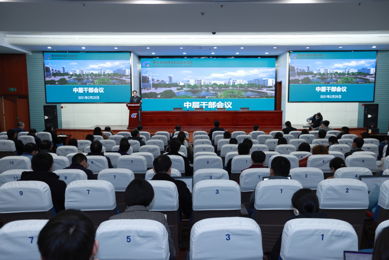2021年2月25日上午,学校在图文报告厅召开新学期全校中层干部会议。党委书记吴访升主持会议并作了讲话。党委副书记、院长洪霄传达2021年全省教育工作视频会议精神,并对新学期工作进行了部署。全体中层及以上干部参加会议。会上,洪霄传达了省教育厅厅长、省委教育工委书记葛道凯在2021年全省教育工作视频会议上的讲话精神。站在“十四五”新起点,葛厅长要求全省教育系统加快建设高质量教育体系,高标准推进现代化教育强省建设,必须把握大势、立足现实、着眼长远,努力服务构建新格局、实现新跨越。一要聚焦党的政治建设,坚持和加强党的全面领导;二要聚焦校园安全稳定,坚持抓好常态化疫情防控和各类风险防范;三要聚焦提升贡献力,坚持教育主动服务发展新格局;四要聚焦人民群众关切,坚持推进城乡教育一体化。加强教师队伍建设,推进教育信息化;五要聚焦内涵建设,坚持推进教育高质量发展。更加注重职业教育提质培优,更加注重高等教育内涵质量,更加注重终身教育开放,更加注重对外开放提质增效;六要聚焦热点难点,坚持不懈提高教育满意度。要确保高考招生平稳有序开展,加快推进教育评价改革,切实抓好扶困助学。洪霄从加强常态化疫情防控工作、深入