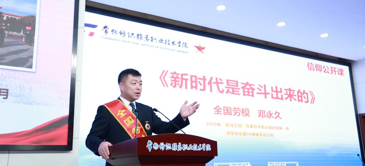 2020年12月11日清晨,常州纺织服装职业技术学院师生喜上眉梢,脸上洋溢着自豪和骄傲,我校染美891班学生、全国劳动模范邓永久今天将荣归母校。就在不久之前,邓永久获得了全国劳模的光荣称号,在全国劳动模范和先进工作者表彰大会上受到隆重表彰,他的事迹也在各大媒体被争相报道,学校里师生间都在津津乐道地谈论着他的喜讯。勤励奋斗历程上午,邓永久在党委书记吴访升陪同下来到学校为其专门设置的“全国劳动模范邓永久创新工作室”,工作室内首先印入眼帘的是习近平总书记在全国劳动模范和先进工作者表彰大会上的讲话精神:“光荣属于劳动者、幸福属于劳动者,社会主义是干出来的、新时代是奋斗出来的。”工作室里还展出了邓永久从学习到工作的经历、先进事迹,以及他的部分作品。吴访升与邓永久共同为创新工作室揭牌仪式。邓永久向学校捐赠了两幅《齐白石原印印拓》,并和常州纺院青年教师杨湛签订工作室结对协议、与数媒2031班祁昌龙履行了助学结对手续,现场为学生颁发了助学金,同时赠送了《习近平与大学生朋友们》一书。邓永久谈到,他永远不会忘记母校的教育之情,老师的培育之恩,同学的同窗之谊,并表示愿意为母校的发展贡献自己的一份力量。激励奋