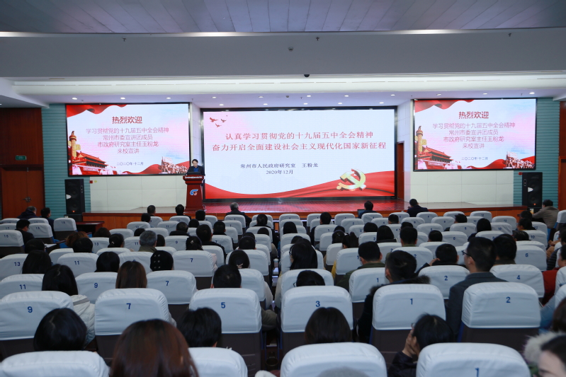 12月9日下午,我校邀请学习贯彻党的十九届五中全会常州市委宣讲团成员、市政府研究室主任王粉龙在图文报告厅以《奋力开启全面建设社会主义现代化国家新征程》为题,为我校教师作党的十九届五中全会精神宣讲报告。校党委领导班子成员、校党委理论学习中心组成员、中层干部、全体教师参加学习。宣讲会由党委委员、宣传部部长夏斌主持。王粉龙从关于全会的基本概况;准确把握我国进入新发展阶段的重大意义、有利条件和重要特征;准确把握2035年远景目标和“十四五”时期我国发展的指导方针、主要目标;准确把握“十四五”时期经济社会发展的重点任务;准确把握构建新发展格局的战略构想和重要着力点;坚持党的全面领导,动员各方面力量为实现“十四五”规划和2035年远景目标而团结奋斗六个方面进行了系统深入、全面精准的阐释和解读。对全校上下准确理解和全面把握党的十九届五中全会精神和推动学校高质量发展具有指导性意义。会议指出,学习宣传贯彻党的十九届五中全会精神,是学校当前和今后一个时期的重大政治任务,全校要迅速兴起学习宣传贯彻党的十九届五中全会精神热潮。学习领会好、宣传贯彻好习近平总书记重要讲话精神和全会精神,要切实把学习宣传贯彻工作作