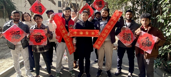 1月28日上午,在乙巳蛇年新春佳节来临之际,校党委委员、副校长张震宇到55栋留学生宿舍慰问在校留学生,为他们送去热情洋溢的新春问候和祝福。国际教育学院院长何彦、办公室主任沈蕴琦、辅导员聂妍参与走访慰问。在走访过程中,张震宇与来孟加拉、塔吉克斯坦等国的留学生亲切交谈,详细了解留学生的在校学习生活情况以及假期安排,并代表学校为留学生送上了福字、春联和新春慰问品。“祝你们新春快乐!”“希望同学们在常州纺院过个幸福年!”亲切的祝福让所有身在异国他乡的留学生深切感受到了学校的关爱和温暖。现场气氛热烈、温馨祥和,师生畅叙情谊、互致祝福,共同庆祝中国蛇年的到来。留学生对学校的周到安排和温情工作表示感谢,纷纷表示将珍惜在学校的学习机会,努力提高自己的学业水平,为中外文化交流做出更大的贡献。此次慰问活动增强了留学生对学校的归属感和认同感,进一步拉近了学校与留学生之间的情感纽带。今年寒假我校共有14名留学生留校,在放假前已经将各项安全保障工作切实落到实处,确保留校留学生在中国过一个平安幸福年。图:沈蕴琦 文:聂妍 审核:何彦除夕看望慰问在校留学生
