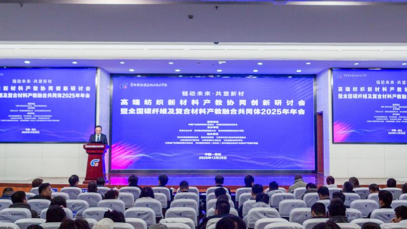 2025年12月25日,高端纺织新材料产教协同创新研讨会暨全国碳纤维及复合材料产教融合共同体2025年年会在我校隆重召开。本次会议汇聚政府部门、行业协会、产业链企业、院校及科研机构代表80余人,聚焦高端纺织新材料、碳纤维及复合材料产业应用场景,共同探讨“产业需求牵引、院校精准培养、企业全程参与、研发同步推进”的协同机制,推动形成人才供给与产业需求高度匹配、技术创新与教学改革深度融合的产教融合新格局。本次会议由中国产业用纺织品行业协会、中国纺织服装教育学会指导,天津工业大学、新创碳谷集团有限公司、常州纺织服装职业技术学院共同主办。中国纺织工业联合会副会长、中国纺织工程学会党委书记李陵申、中国产业