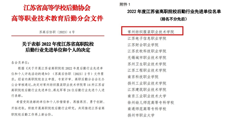 根据《关于开展江苏省高职院校2022年度后勤行业先进单位和个人评选活动的通知》(苏高后协职〔2023〕2号)文件要求,经省内高职院校自主申报、专家评审、高职后勤分会会长办公会审核通过,我校被评为“2022年度江苏省高职院校后勤行业先进单位”。我校将以此为契机,继续在聚焦推进校园节能创效、打造“绿色”品牌,聚焦完善后勤服务体系、打造“服务”品牌,聚焦提升师生获得感、打造“满意”校园,聚焦推进重点项目、助理“高水平”建设,聚焦提升后勤质量、打造“幸福”后勤等方面,积极探索实践,不断增强责任感和使命,为在校师生提供优质后勤服务,用奋斗精神为师生创造幸福,促进学校后勤工作持续提升,努力在新时代做出新贡献。供稿:后勤保障部 审核:管俊洛