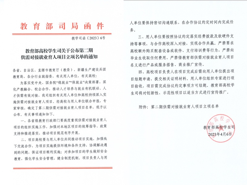 近日,教育部发布了《教育部高校学生司关于公布第二期供需对接就业育人项目立项名单的通知》,创意学院与完美世界教育科技(北京)有限公司、广东虚拟现实科技有限公司对接的2个项目获准立项。供需对接就业育人项目是教育部为落实党中央、国务院“稳就业”“保就业”决策部署而组织开展,旨在通过政府搭台、企业支持、高校对接、共建共享,深化产教融合,以产业和技术发展的最新需求来推动高校人才培养改革,促进培养目标、师资队伍、资源配置、管理服务的多方协同,实现教育链、人才链与产业链、创新链有机衔接,培养支撑引领经济社会发展需要的高素质技术技能人才。创意学院将以此次立项为契机,与用人单位共同推动项目规范有序开展,继续完善学生就业与人才培养、产教融合等方面的协同育人机制,力争实现“零接轨”企业人才供需,进一步拓宽毕业生就业渠道、提升毕业生就业能力,促进学生高质量充分就业。创意学院供稿审核:李方联图1 文件截图图2 文件截图