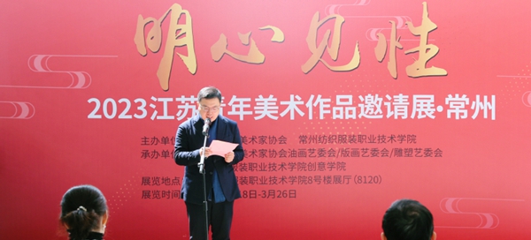 2023年3月18日上午,“明心见性——江苏青年美术邀请展”于常州纺织服装职业技术学院创意学院隆重开幕,开幕式由创意学院青年教师易琨主持。展览由江苏省青年美术家协会指导统筹,常州纺织服装职业技术学院主办,省青年美术家协会油画艺委会、版画艺委会、常州市青年美术家协会、雕塑艺委会和常州纺织服装职业技术学院意学院联合承办,常州市美术家协会青年分会、志愿者分会协办。共展出油画、版画、雕塑作品60余件。出席展览开幕式的嘉宾有,江苏省青年美术家协会副主席、南京大学教授尚荣,常州市文学艺术界联合会副主席蒋小萍、常州市美术家协会副主席冷天明,江苏省青年美术家协会副主席、常州市青年美术家协会主席丁奕,江苏省青年美术家协会副主席、吴冠中艺术馆副馆长袁景,南京市青年美术家协会秘书长傅礼城,常州大学教授王驰,省青年美术家协会油画艺委会主任曹景德,省青年美术家协会雕塑艺委会主任王超,以及参展画家胡吉宏、郭维奥、霍紫平、孙文烨、马致远、王晓群、杨湛、应志红、刘思、刘恬、严峻、徐英姿。主办方常州纺织服装职业技术学院党委委员、副院长邓凯,党委委员、宣传部长夏斌,文化传承与创新中心主任顾明智,创意学院党政班子成员及师生
