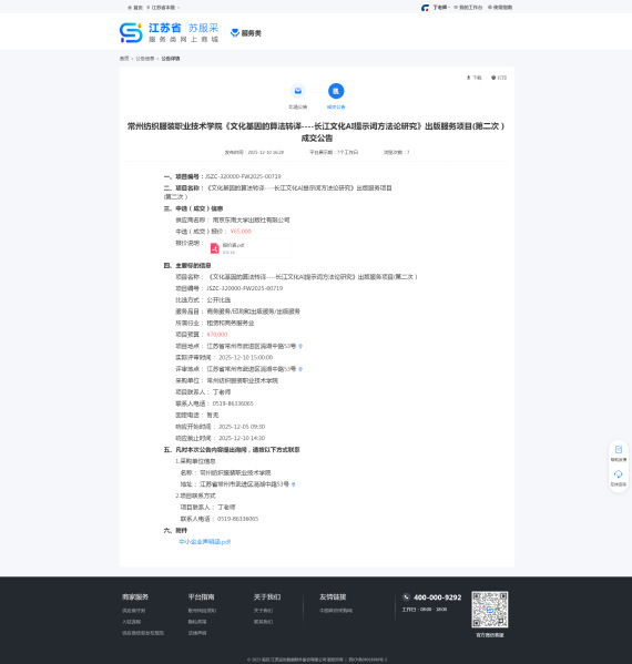 我校数字化设计与样品开发实训室设备采购项目以询价方式采购,现将结果公告如下:一、项目名称:数字化设计与样品开发实训室设备采购二、采购编号:CB128072025000022三、公告媒体及日期:2025年11月21日起在常州纺织服装职业技术学院网站上发布采购公告四、确定流标日期:2025年11月27日五、流标理由:参与投标的供应商不足三家六、联系方式:联系人:丁老师联系电话:0519-86336065。联系地址:江苏省常州市武进区湖塘镇滆湖中路53号常州纺织服装职业技术学院2025年11月28日
