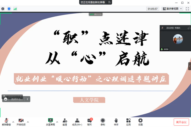 为进一步加强辅导员队伍建设,搭建交流讨论的平台,推动经验共享,能力提升,2月21日晚我校学生工作处在领秀展厅举办第70期辅导员沙龙暨辅导员队伍“赋能提质”工程启动会,学生工作处处长李洁琦、副处长陆亚波,各二级学院党总支副书记,全体辅导员及学生处相关人员共计65人参加沙龙,活动由李洁琦主持。本次沙龙由深圳职业技术学院心理中心余思慧、王靖、何健龙作了《走进积极心理,靠近幸福生活——“幸福季”心理育人》的讲座。讲座从项目背景及意义、项目过程与特点、项目成果展示、反思与总结四个方面介绍了深职“幸福季”心理育人项目,该项目以积极心理学的幸福五要素“RERMA”模型为理论基础,将积极情绪、投入、人际关系、意义及成就以及作为基石的优势和美德六大板块活动项目串联起来,强调参与性,体验性,满足学生对精神、心理需求的需要,实现心理育人工作思路从被动到主动,问题风险到积极发展,重点关注到全员覆盖的转变,同时介绍园艺心理治疗,三件好事“一院一幸福”特色项目,为我校心理健康教育工作提供了范式和借鉴。“生长中的幸福源力在不断绽放——这是我在本次课程学习中的最大感悟。心理育人工作要有持续的战斗力、源发的生命力,需要